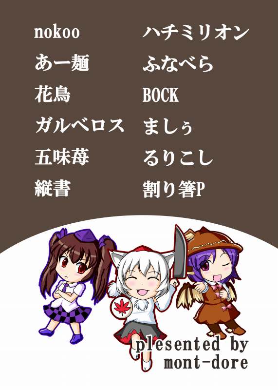 の豪華メンバーでお送りする射命丸まんがの合同誌。僕は相変わらず趣味に走ってますが、他のメンバーは安定の天狗漫画です。安心してご購入下さい。ていうか調子に乗って100部も刷ってしまったのでぜひ買ってくださいw