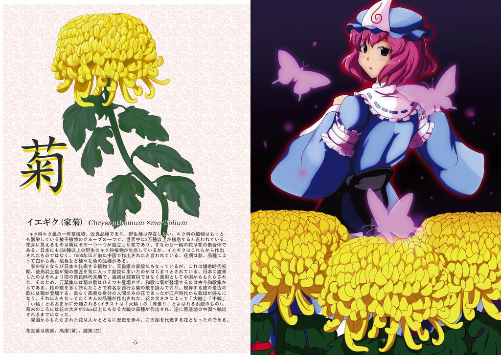 右側がキャラクターのイラスト、左側が花の絵+解説となっております。東方projectの魅力的なキャラクターを通じて花について少しでも知っていただければと思い企画いたしました。