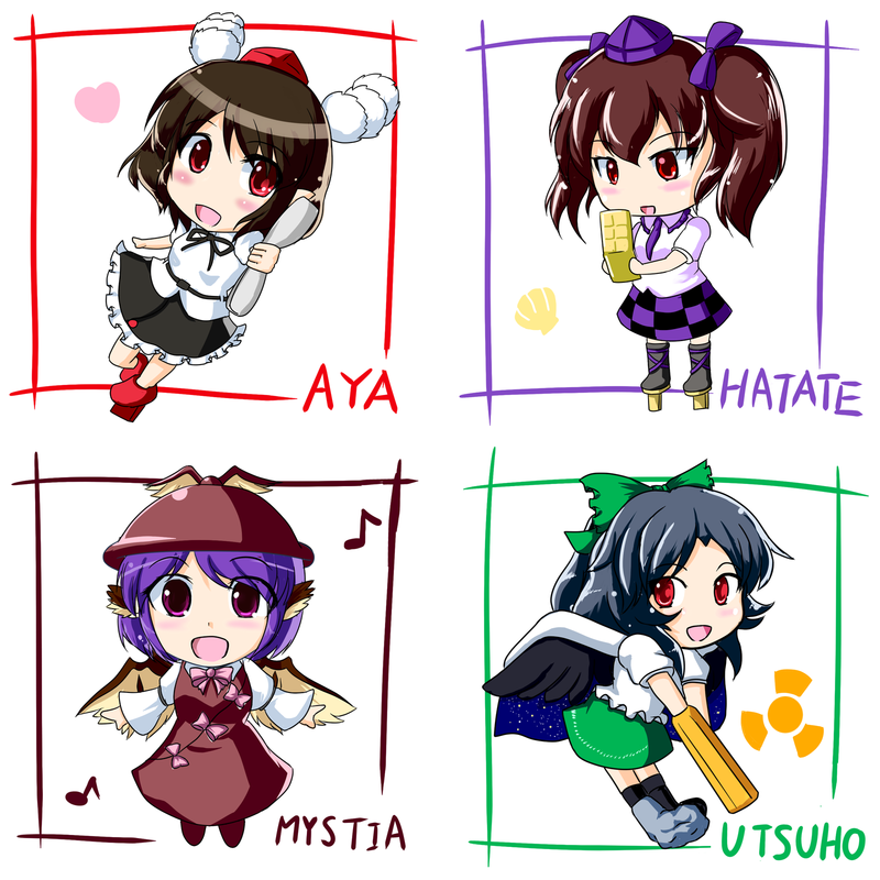 とりあえず不本意ながらハブってしまったお空を追加してまとめた画像を作りってみました。鳥カルテットは仲がよさそうでもう本当に大好きです。個人的にはバカルテットよりこっちのほうがしっくりくるんです。