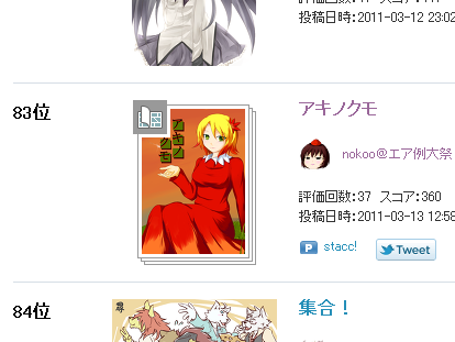 pixivにupした新作「アキノクモ」ですが、なんと3月14日付けルーキーランキング83位、同月15日95位を獲得しました!やった!