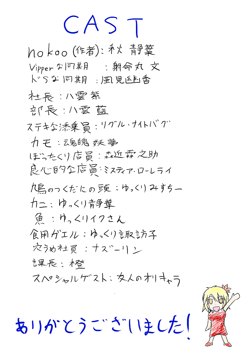 読後、自分が愛したものは本当に幻想郷だったのだろうか。このまま自分の描いた世界を幻想郷のお話として出していいのだろうか。そういう疑問がつきまといました。